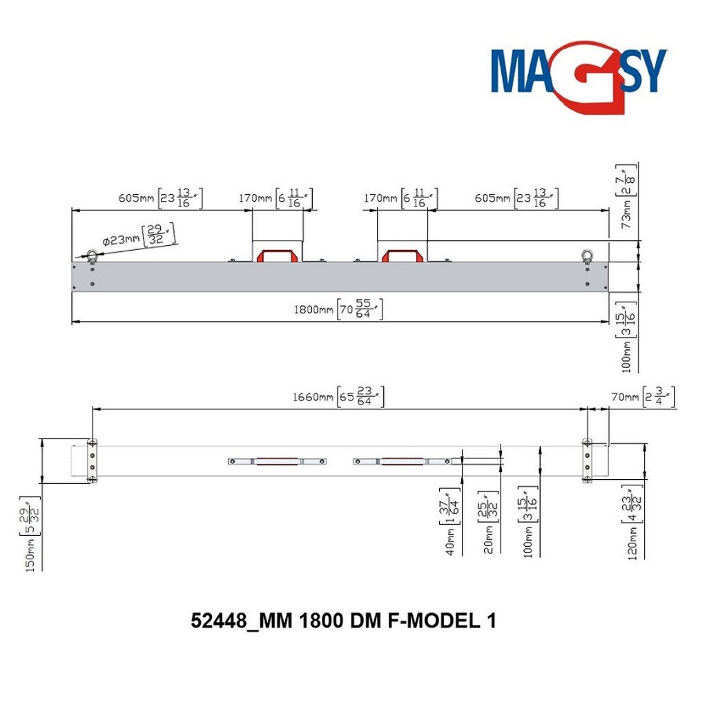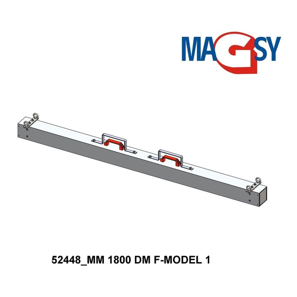 Le balai magnétique convient pour collecter les impuretés ferromagnétiques à l’aide d’un chariot élévateur. Le balai est large de 1 800 mm et contient des aimants en ferrite. Le balai magnétique est en aluminium EN-AW 6060. Le balai est traité en surface par ponçage au Scotch-Brite. La température maximale de fonctionnement du balai magnétique est de 80 °C, son poids total est de 23,4 kg. Raccordement :4 œillets de suspension Ø 23 mm.