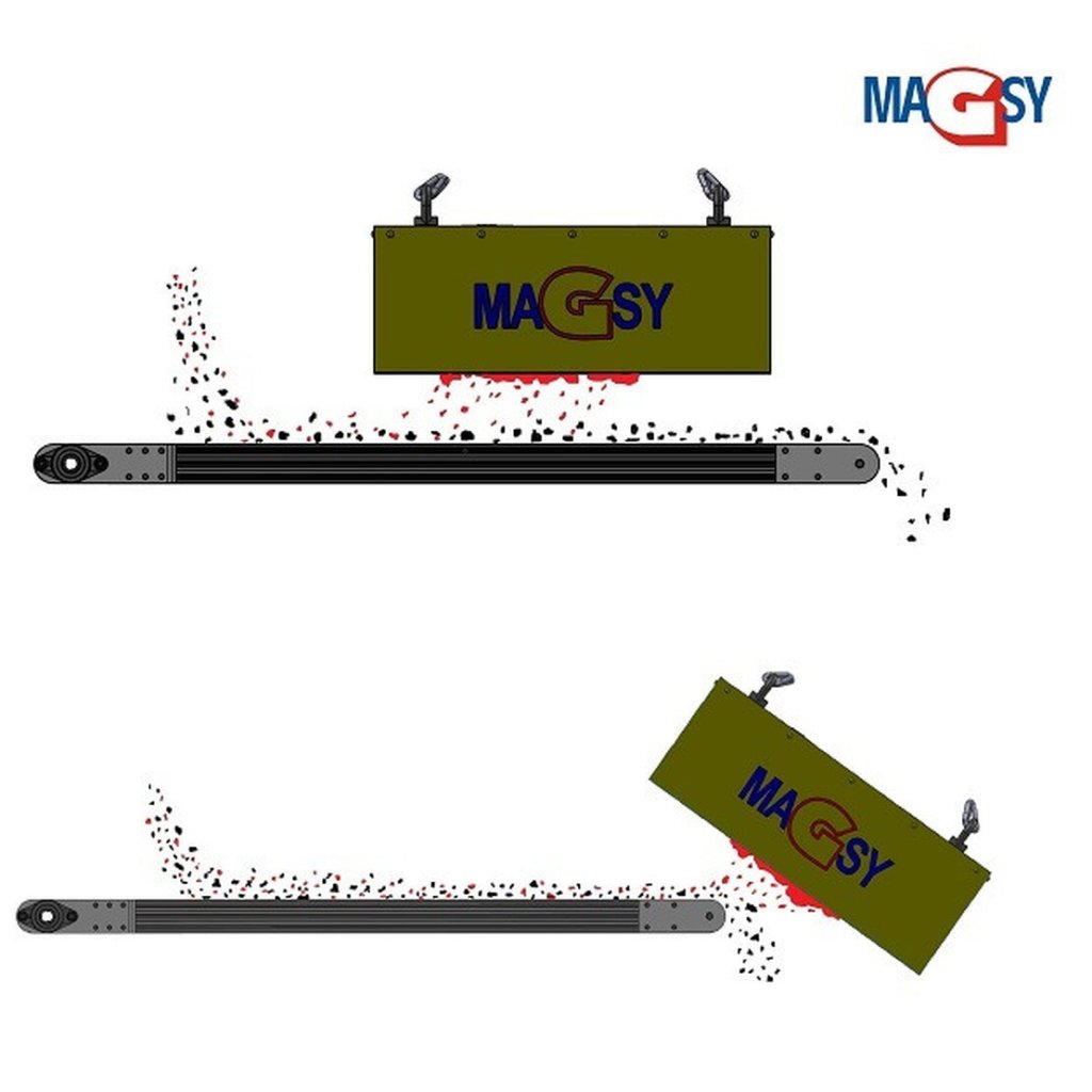 Le séparateur magnétique situé au-dessus de la bande transporteuse (plaque magnétique) convient pour séparer les impuretés ferromagnétiques plus importantes des matériaux facilement perméables pendant leur transport sur la bande transporteuse. La vitesse maximale de la bande transporteuse transportant le matériau peut être de 1,5 mètre par seconde. C'est une plaque magnétique qui agrippe le métal ferromagnétique et le métal ferromagnétique est attrapé et maintenu sur elle par la force magnétique. Les métaux magnétiques sont ensuite retirés manuellement. <L'installation de la plaque magnétique n'est possible que conformément à la galerie d'images (ne pas installer la plaque magnétique d'une autre manière que celle montrée dans les images sans l'autorisation expresse du fabricant). Si les images montrant des exemples d'installation de la plaque magnétique ne sont pas claires pour vous et sont incompréhensibles pour vous, veuillez vérifier avec le fabricant avant d'acheter la plaque magnétique. La plaque magnétique (séparateur magnétique) est livrée sans structure pour la suspendre/installer. Elle est équipée de 4 pattes de suspension pour accrocher la plaque magnétique. La structure de suspension de la plaque magnétique (non incluse) doit être suffisamment rigide et solide pour éviter toute déviation indésirable et la transmission d'éventuelles vibrations à la plaque magnétique. Nous recommandons l'utilisation de suspensions réglables en hauteur en raison de la possibilité d'ajuster la hauteur de la suspension de la plaque magnétique et de se rapprocher ainsi du matériau à transporter pour plus d'efficacité.