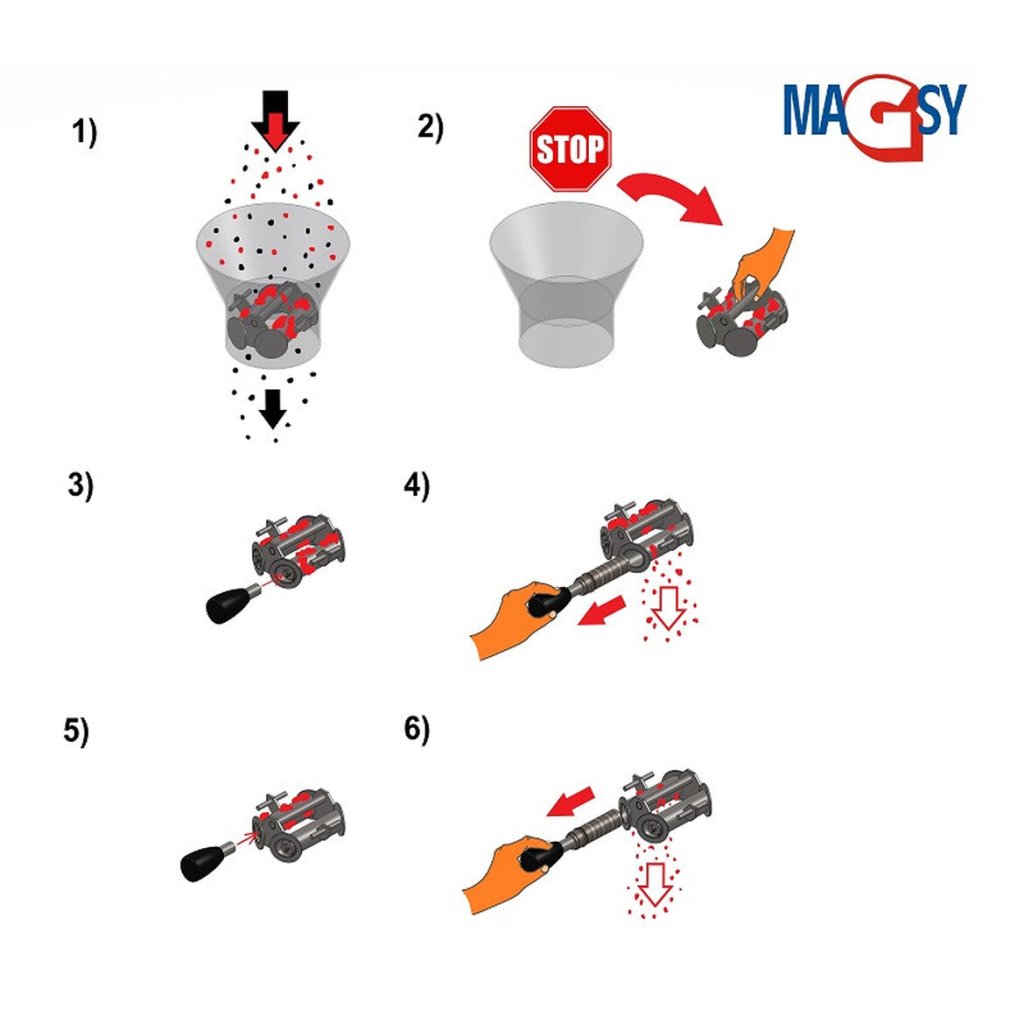 L'aimant de trémie n'est pas destiné à la séparation magnétique de métaux non magnétiques non ferromagnétiques ni à la séparation magnétique de pièces ou de parties contenant des métaux ferromagnétiques (par exemple, des pièces en plastique avec des parties métalliques pressées, des cadres de fenêtres écrasés avec des restes de bandes métalliques, des granulés de bois avec des fils fins pressés...). Si vous devez séparer de telles impuretés ferromagnétiques, n'utilisez pas cet aimant dans la trémie et contactez nos experts en séparation magnétique qui vous conseilleront sur l'autre séparateur magnétique à utiliser ou sur le type à ajouter à votre installation de séparation.
