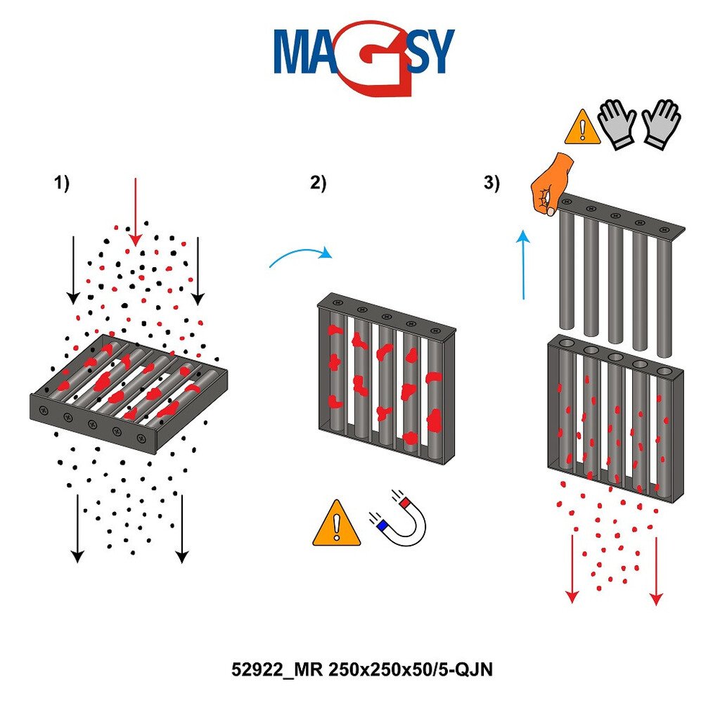 La grille magnétique ne doit pas être touchée par des objets plus grands que ceux que nous indiquons (diamètre maximal de 3 mm, 3x3x3 mm), à l'exception des impuretés ferromagnétiques, que nous décrivons ci-dessus en quantités aléatoires. Si vous êtes préoccupé par la présence d'impuretés ferromagnétiques ou autres de plus grande taille, il est nécessaire de régler au préalable le tamis avec une taille de maille de 3 mm au maximum, afin que ces objets plus grands et indésirables soient déjà capturés avant d'entrer dans la grille magnétique (après avoir installé le tamis, il est nécessaire d'envisager de réduire la charge de capacité, la perméabilité, de la grille magnétique). Le tamis n'est pas inclus dans la livraison de la grille magnétique. Veuillez également noter que votre matériau peut contenir une grande quantité d'impuretés métalliques fines (poussière magnétique métallique très fine d'une taille inférieure à 1 µm), qui peuvent recouvrir les tubes magnétiques et rendre la grille magnétique impraticable (les fines particules magnétiques tassent le matériau et submergent l'ensemble du système). En même temps, la force/efficacité magnétique de la grille magnétique est fortement réduite. Si, immédiatement après le passage du matériau dans la grille magnétique, les tubes magnétiques se recouvrent et se "cachent" entièrement de poussière de fer, il ne s'agit pas d'un défaut de la grille magnétique, mais vous devez renforcer la séparation magnétique à l'aide d'un autre séparateur/grille magnétique ou nettoyer la grille magnétique plus souvent, car votre matériau contient probablement une très grande quantité de particules ferromagnétiques.