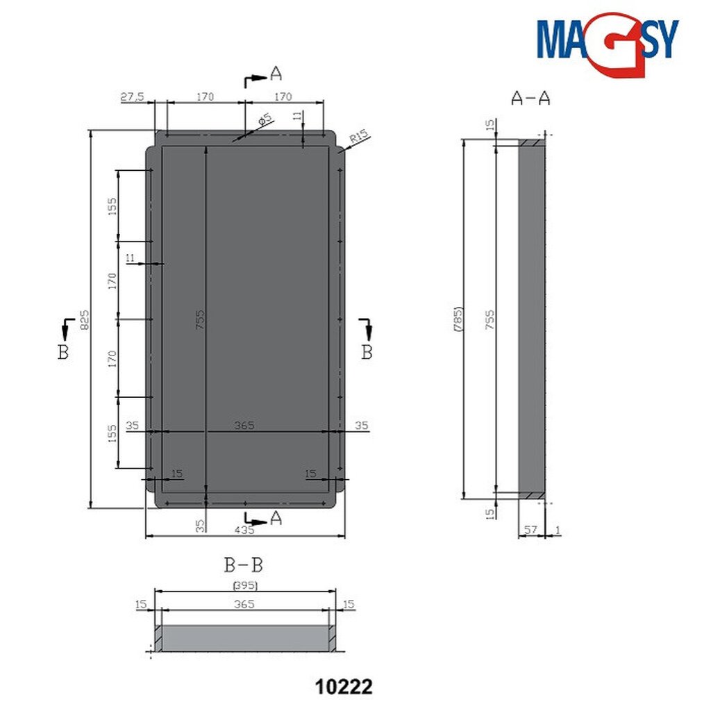 Gamme dimensionnelle en mm - 400x600, 400x750, 400x800, 500x660, 500x800, 500x900, 500x990, 600x600, 600x750, 600x800, 600x900.
