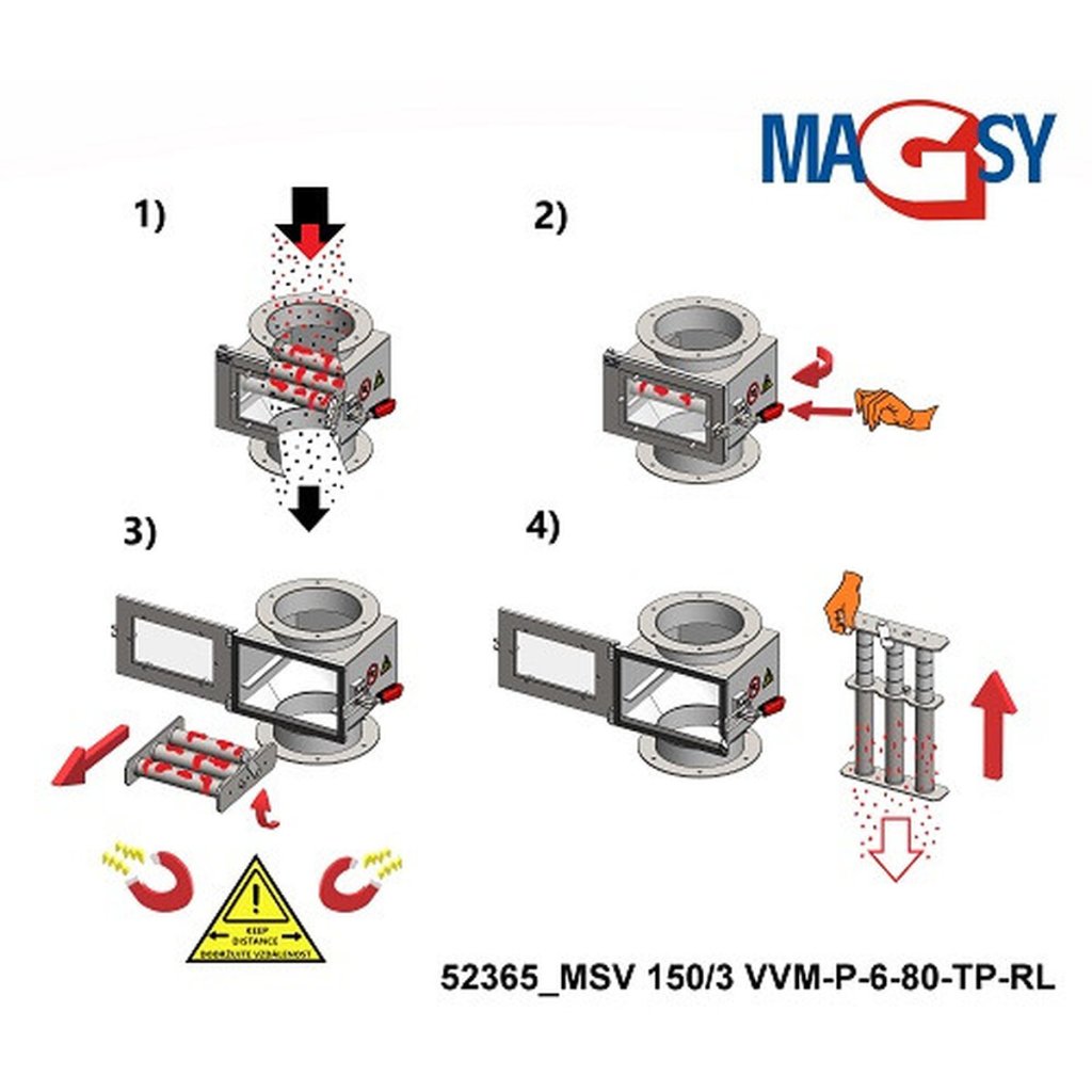 Les grilles magnétiques du séparateur magnétique sont conçues pour capturer autant de contaminants magnétiques métalliques que possible. Cependant, tout dépend de la quantité de ces impuretés magnétiques présentes dans votre matériau. La technologie et les capacités spécifiques doivent toujours être prises en compte. Si nécessaire, d'autres types de séparation magnétique doivent être spécifiés ou ajoutés. Ne vous fiez pas uniquement à ce séparateur magnétique. En cas de doute, n'utilisez pas ce type de séparateur magnétique et contactez nos experts en séparation magnétique à tout moment.