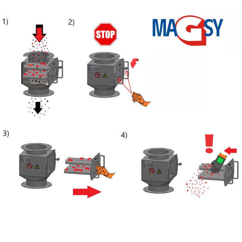 Les grilles magnétiques du séparateur magnétique sont conçues pour capturer autant de contaminants magnétiques métalliques que possible. Cependant, tout dépend de la quantité de ces impuretés magnétiques présentes dans votre matériau. La technologie et les capacités spécifiques doivent toujours être prises en compte. Si nécessaire, d'autres types de séparation magnétique doivent être spécifiés ou ajoutés. Ne vous fiez pas uniquement à ce séparateur magnétique. En cas de doute, n'utilisez pas ce type de séparateur magnétique et contactez nos experts en séparation magnétique à tout moment.