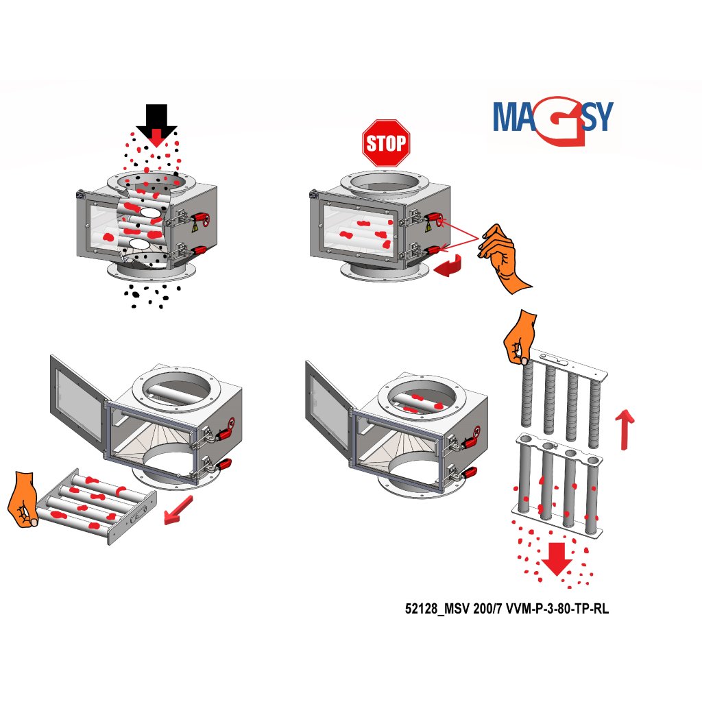 Les grilles magnétiques du séparateur magnétique sont conçues pour capturer autant de contaminants magnétiques métalliques que possible. Cependant, tout dépend de la quantité de ces impuretés magnétiques présentes dans votre matériau. La technologie et les capacités spécifiques doivent toujours être prises en compte. Si nécessaire, d'autres types de séparation magnétique doivent être spécifiés ou ajoutés. Ne vous fiez pas uniquement à ce séparateur magnétique. En cas de doute, n'utilisez pas ce type de séparateur magnétique et contactez nos experts en séparation magnétique à tout moment.