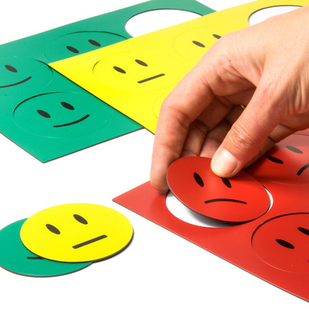 Nous vous proposons les grands symboles magnétiques « Smiley » dans un kit de trois couleurs – vert, jaune et rouge. Les « Smileys » magnétiques sont fabriqués dans des feuilles magnétiques de couleur (format A5). Sur chaque feuille, vous trouverez toujours 6 « Smiley ». Au total, un set contiendra donc 18 « Smileys » qui pourront être utilisés pour mettre en valeur un contenu sur divers tableaux, plannings et autres supports magnétiques ou encore, juste pour indiquer aux autres votre état d’esprit ou votre humeur.