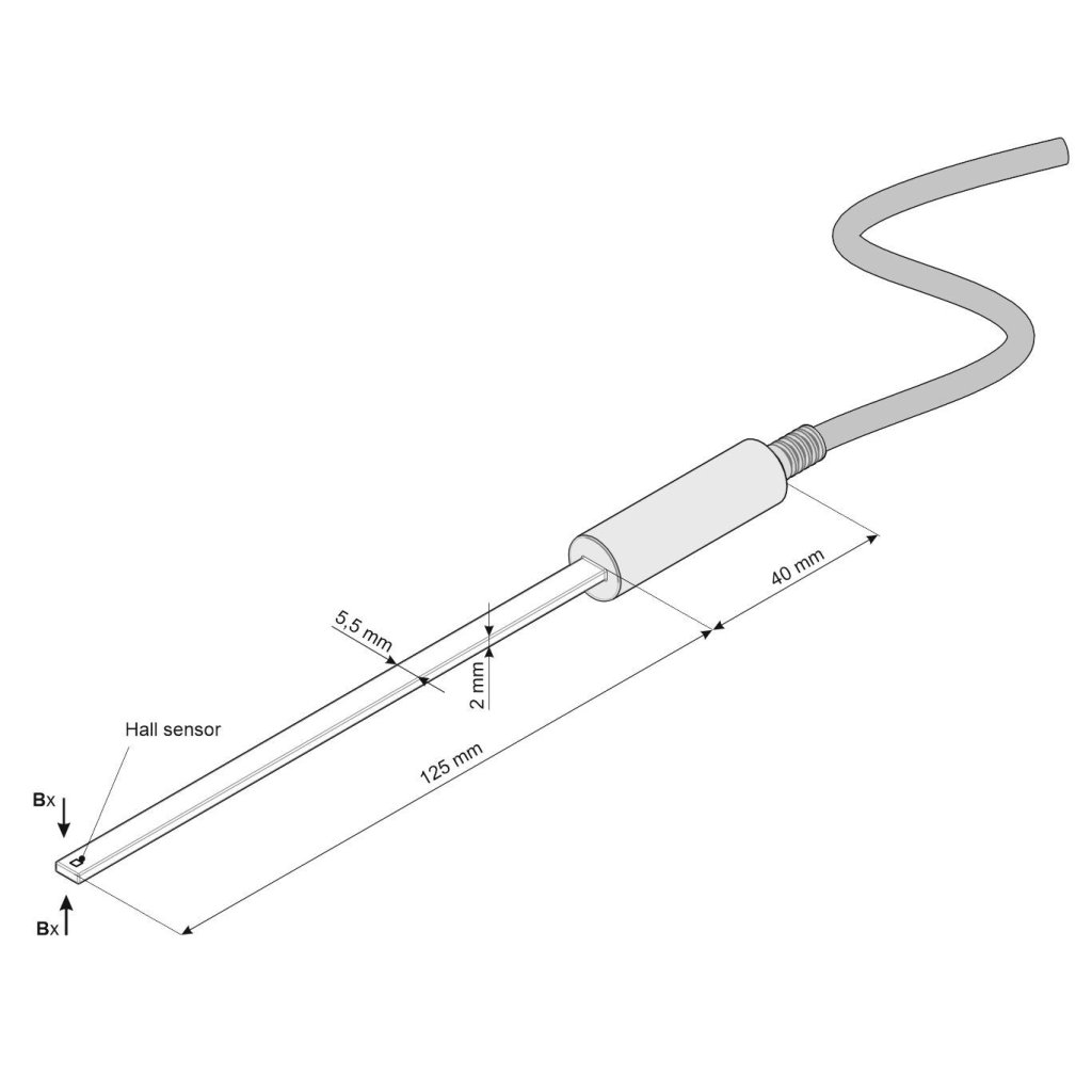 La sonde à effet Hall MAGMAG ST est utilisée pour mesurer l’induction magnétique dans un espace ou dans une fente. Le capteur à effet Hall, qui est mécaniquement intégré à l’extrémité du porte-sonde, est la seule partie sensible de la sonde. C’est une plaque mince d’une surface d’environ 1 x 1 mm. Le capteur n’est sensible qu’au champ magnétique dans le sens perpendiculaire à cette plaque, dans le sens de la flèche marquée Bx et dans le sens opposé (tourner la sonde ne change que la polarité +/-)